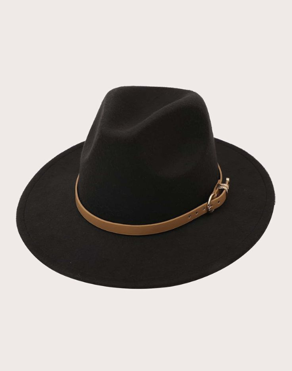A timeless fedora hat with a structured crown and wide brim—available in elegant beige with a brown band and sleek black for a bold, monochrome look.