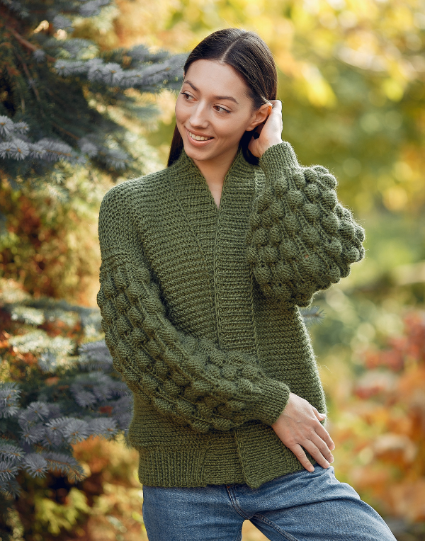 A cozy, hand-knitted forest green cardigan featuring unique bubble sleeves and a ribbed shawl collar—perfect for layering in cooler weather.