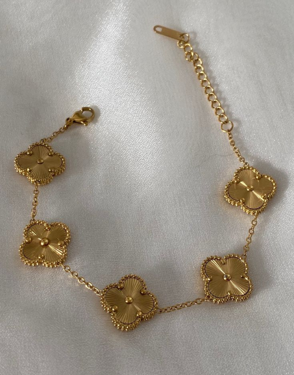Add a graceful touch to your ensemble with the Golden Clover Charm Bracelet, a beautifully crafted accessory that blends delicate design with luxurious detail. Featuring five intricately shaped clover charms, each with ornate patterns and a central bead, this bracelet offers a refined yet playful aesthetic.