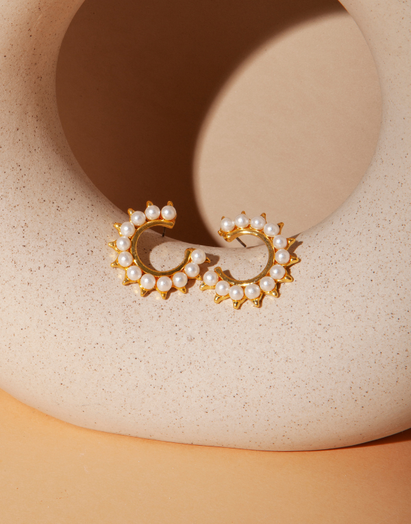 Elegant gold hoop earrings embellished with luminous pearls — a perfect blend of timeless charm and modern sophistication.