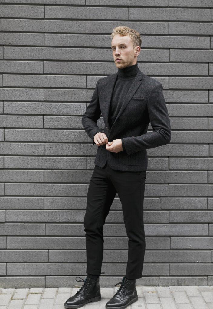 This look is a masterclass in refined minimalism. The dark grey blazer layered over a sleek black turtleneck creates a silhouette that’s both sharp and understated. Paired with slim-fit black trousers and classic leather boots, the outfit balances sophistication with a touch of edge. It’s a versatile ensemble that transitions seamlessly from day to night, casual to formal. Perfect for the modern man who values clean lines, quality fabrics, and timeless style.